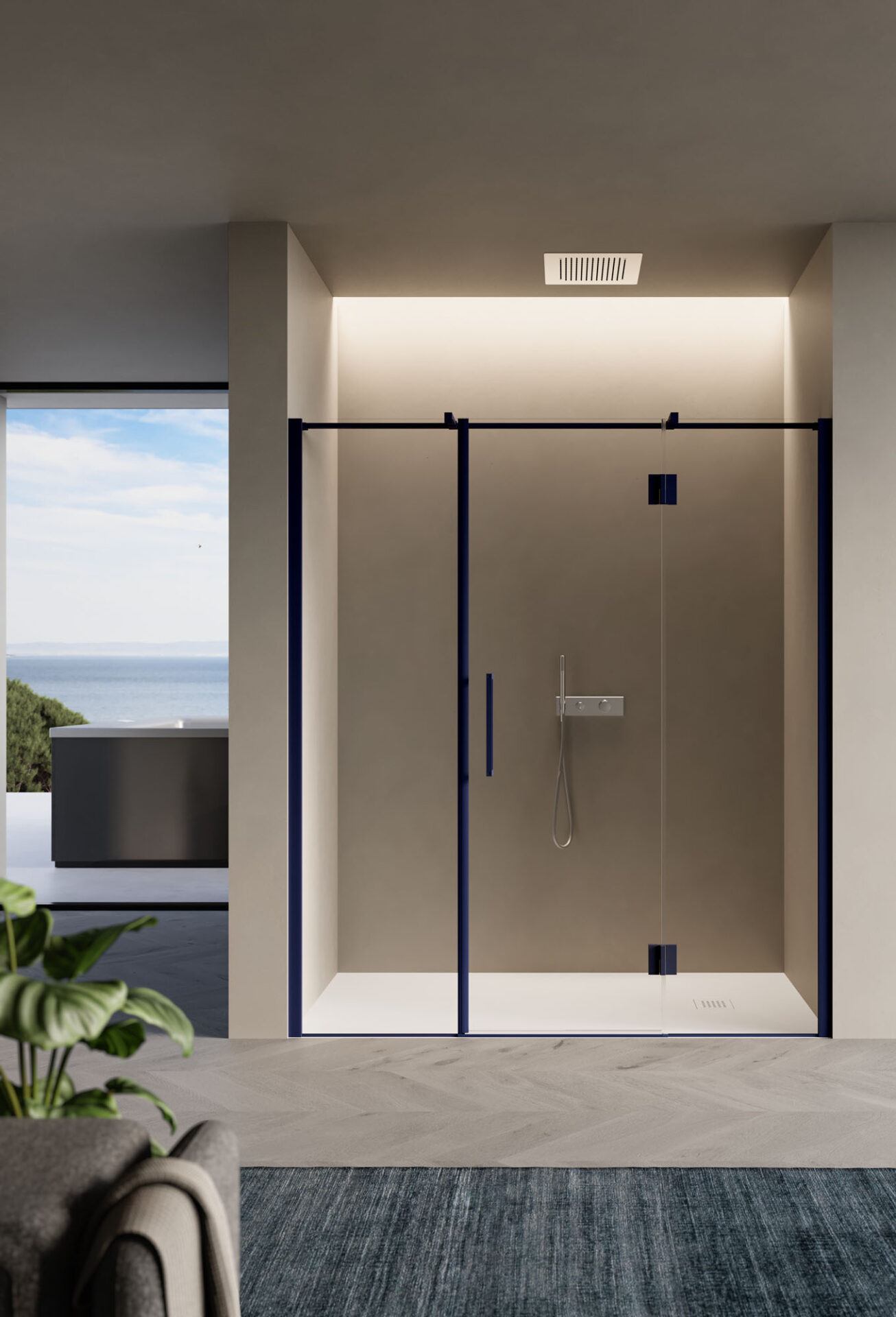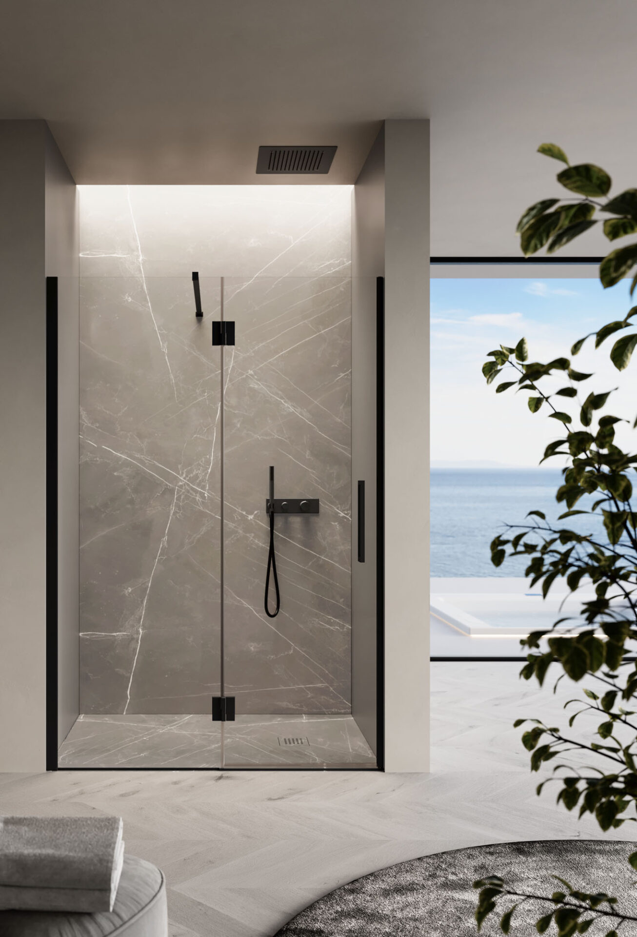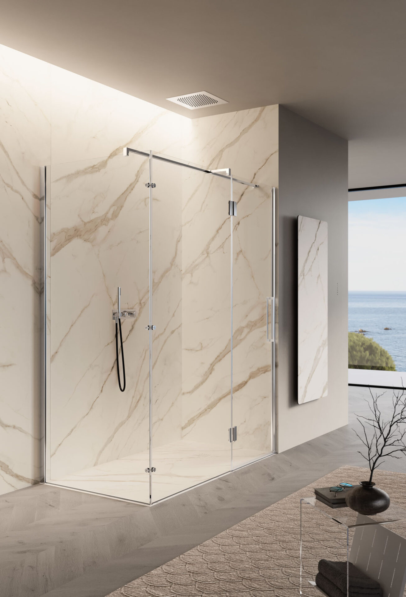 Easy è il box doccia senza telaio con porta battente dal design essenziale, disponibile nella versione in nicchia, ad angolo, parete e muretto. Le cerniere sono completamente a filo vetro nella parte interna che consente un’apertura dell’anta di 180°. La maniglia è bifacciale.