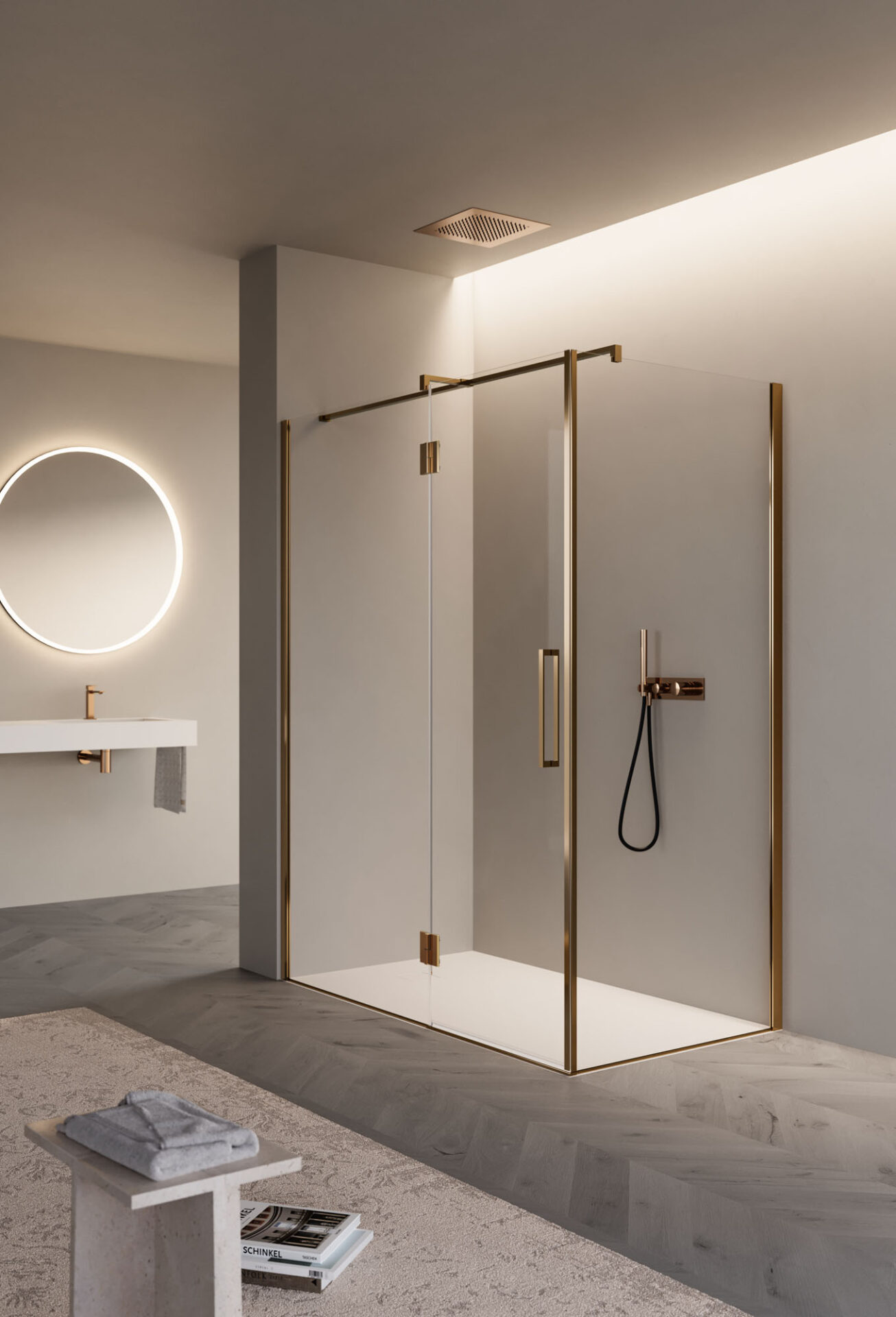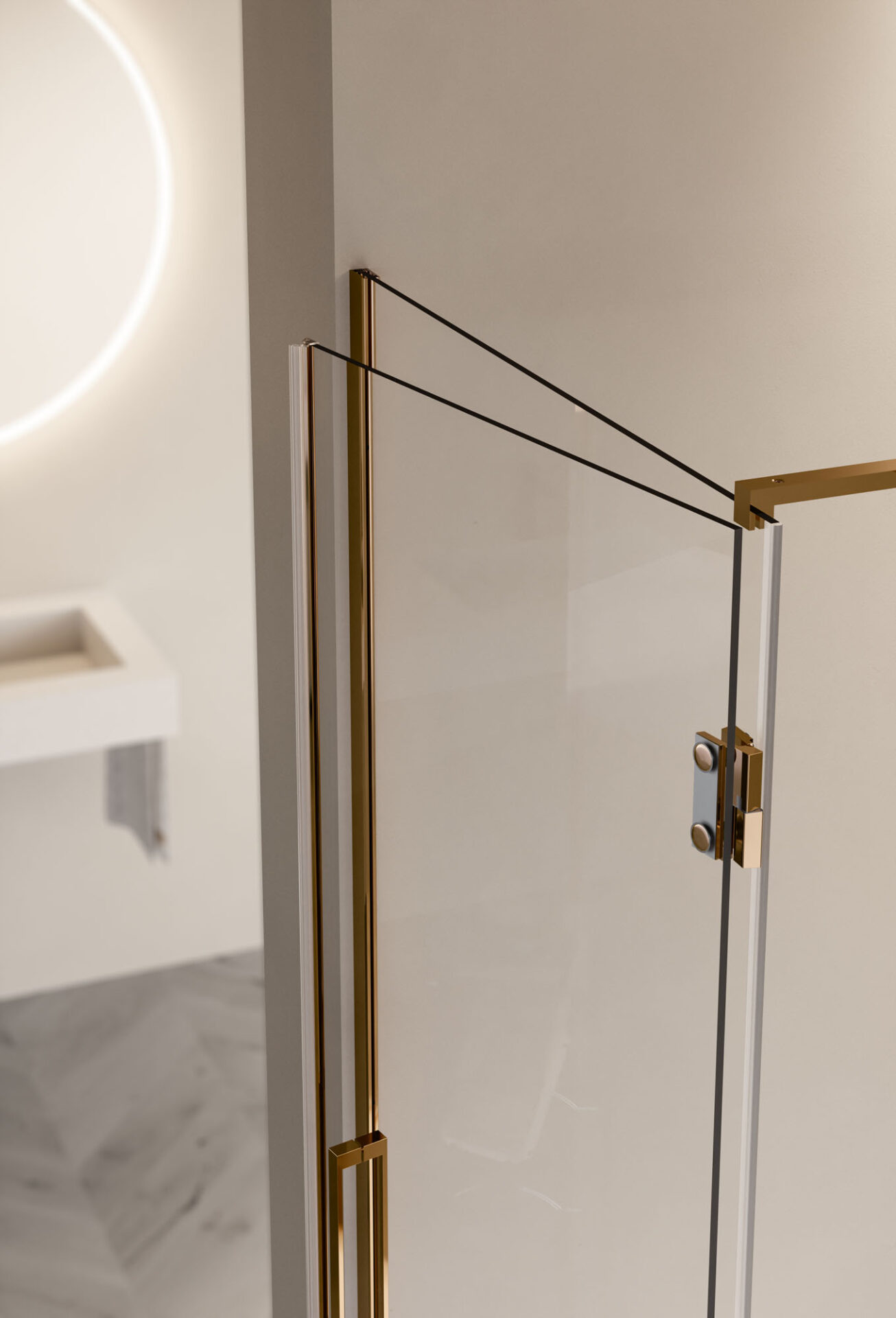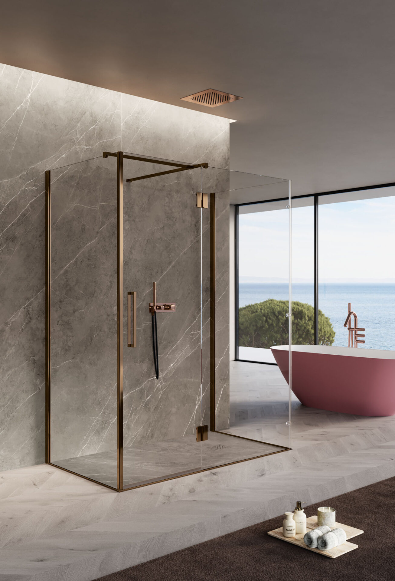 Easy è il box doccia senza telaio con porta battente dal design essenziale, disponibile nella versione in nicchia, ad angolo, parete e muretto. Le cerniere sono completamente a filo vetro nella parte interna che consente un’apertura dell’anta di 180°. La maniglia è bifacciale.