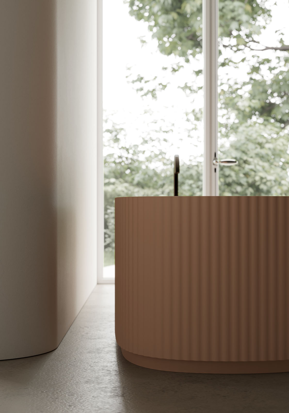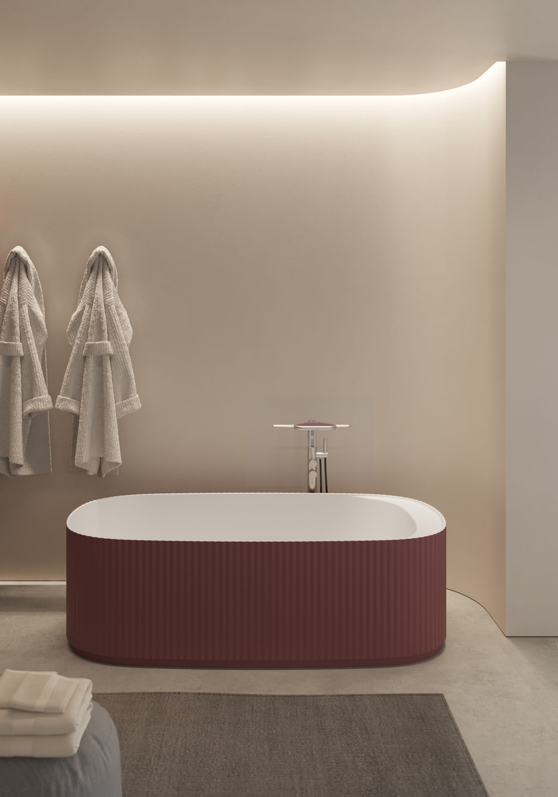 La vasca da bagno freestanding Giove completa il progetto d’arredo nato con l’omonimo lavabo monolite disegnato da Riccardo Gava e vincitore del premio Archiproducts Design Awards 2023 e Red Dot 2024. La vasca Giove ne riprende le morbide onde verticali e sviluppa la forma del lavabo portandola ad un’ellisse allungata capace di accogliere il corpo grazie allo studio ergonomico del volume interno ed esterno. Una delle estremità interne è modellata per sorreggere dorso e spalle e per creare un comodo spazio d’appoggio dedicato alla rubinetteria integrata, se prevista, o se si opta per l’abbinamento con una rubinetteria freestanding, per ospitare i prodotti per la cura del corpo. La piletta brevettata è dotata di sistema integrato di troppo pieno con funzionamento meccanico progettata per aprirsi automaticamente quando l’acqua supera il livello di sicurezza prefissato. Sul fondo del volume vi è una rientranza, uno zoccolo, ulteriore elemento decorativo, che ha però una funzione ergonomica perché lascia spazio al piede e consente di assumere una postura corretta durante la gestualità quotidiana.