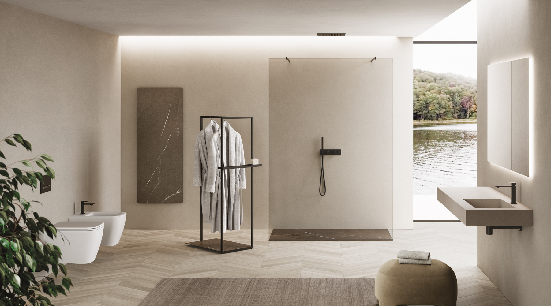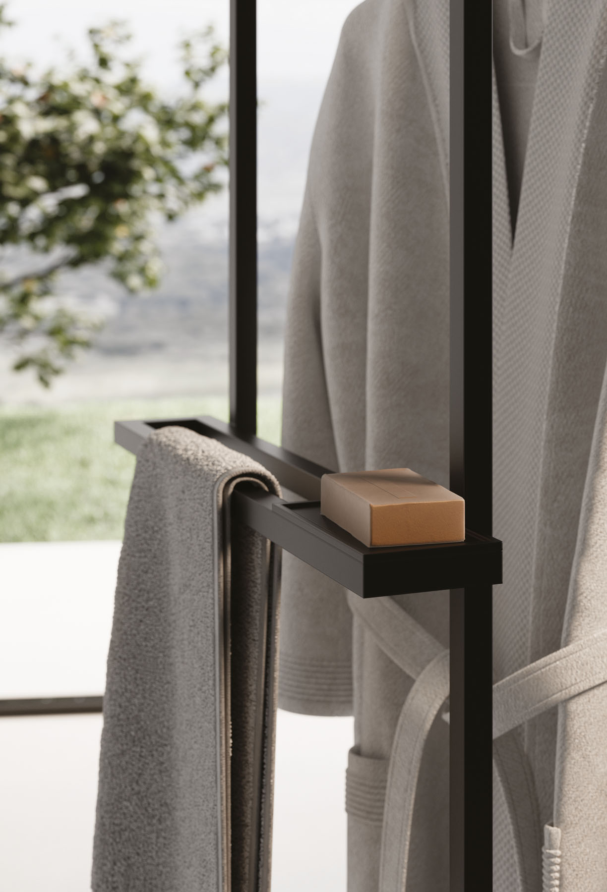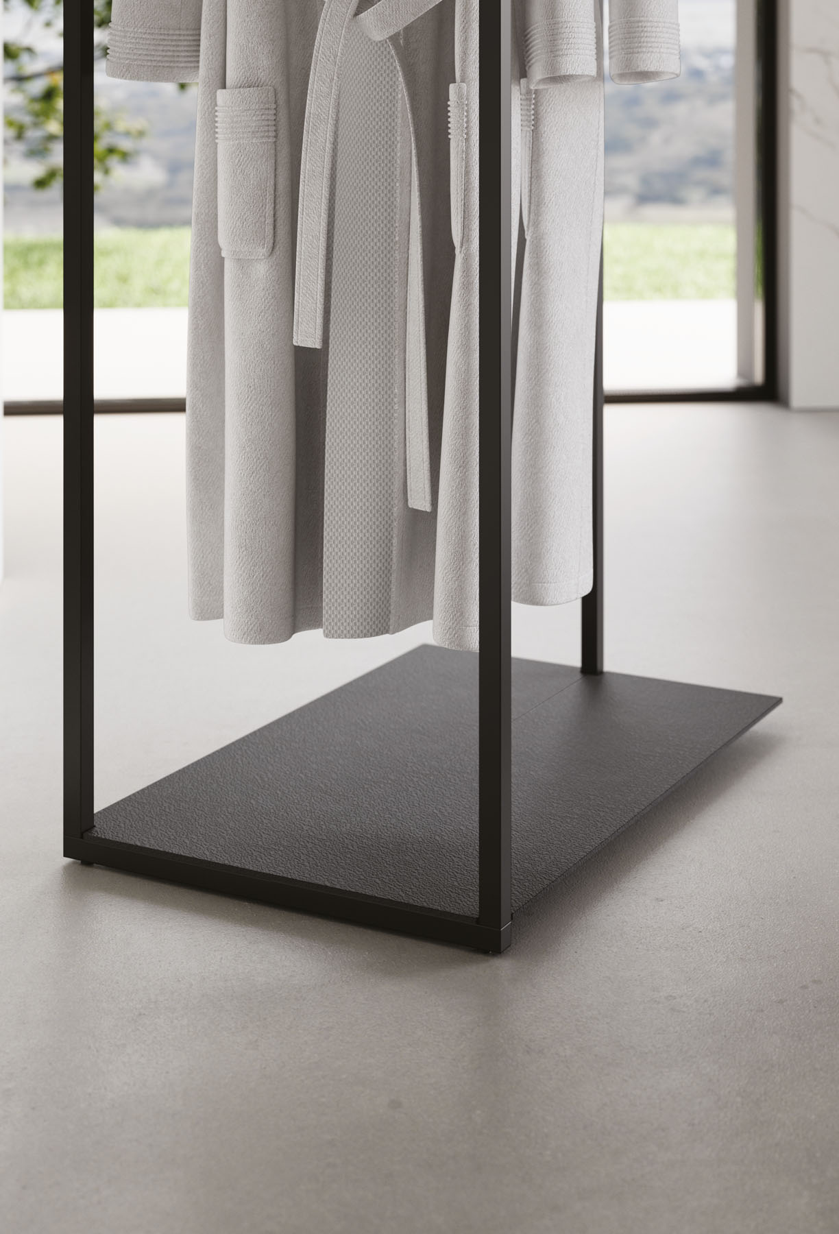 Linee pulite e minimali caratterizzano il design del servo muto Lido arricchito da un comodo piano d’appoggio svuotatasche, un porta asciugamani e una solida base proposta nelle varianti Laminam®, in metallo verniciato in tinta con la struttura o come la texture dei piatti doccia.