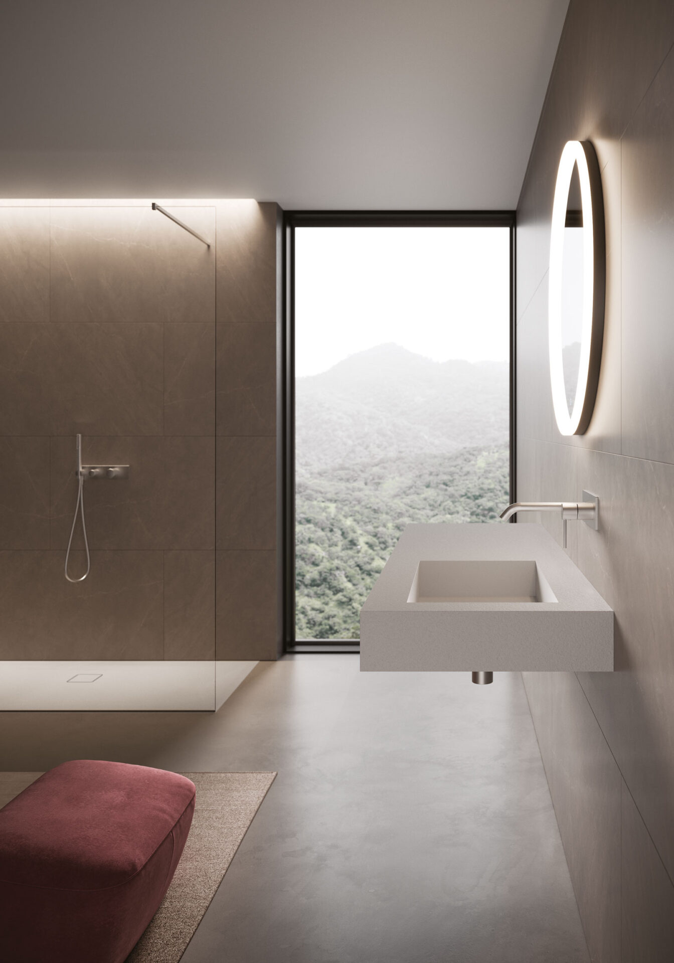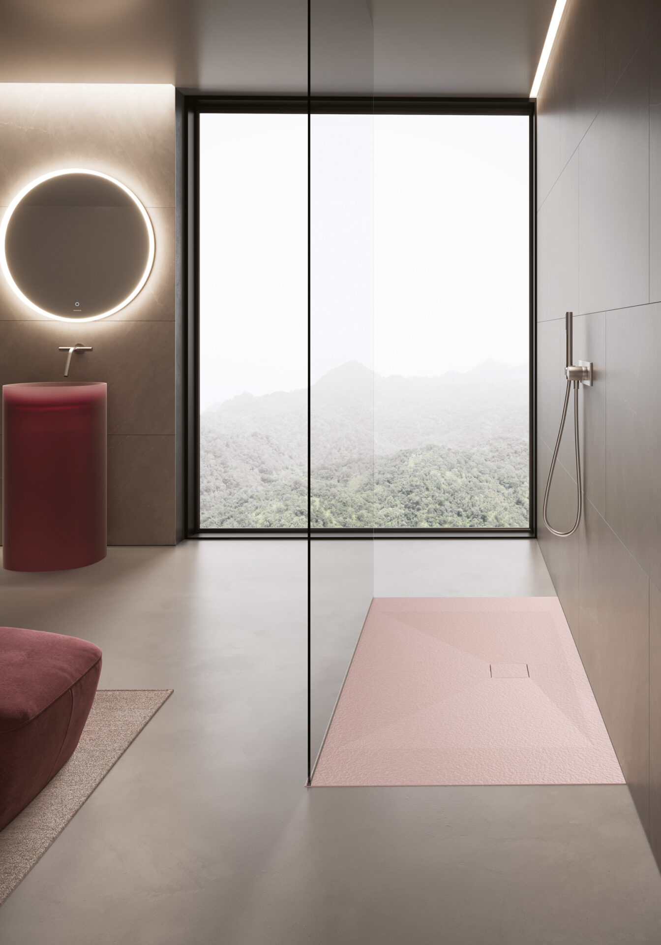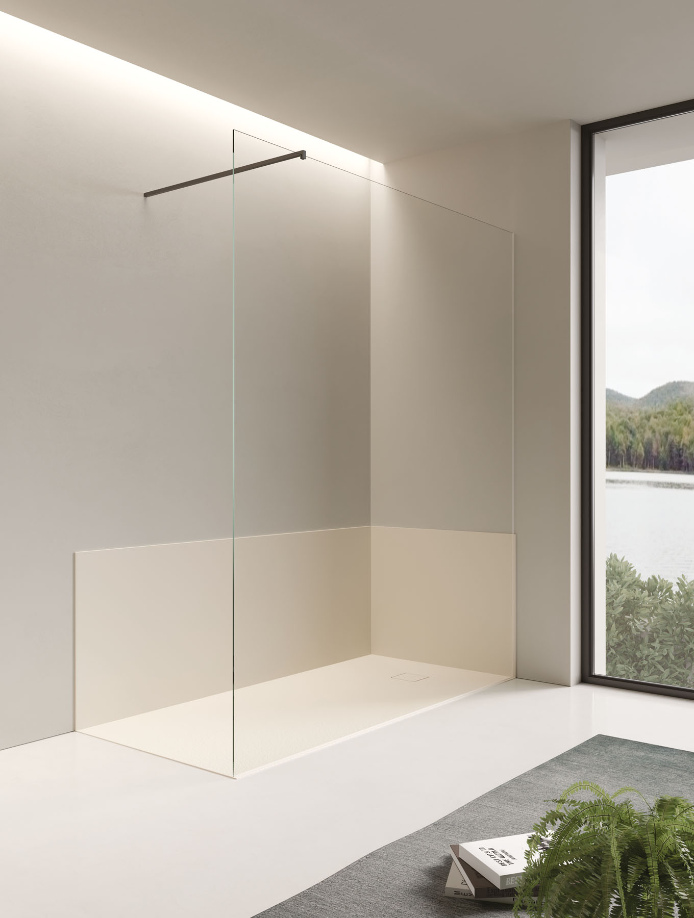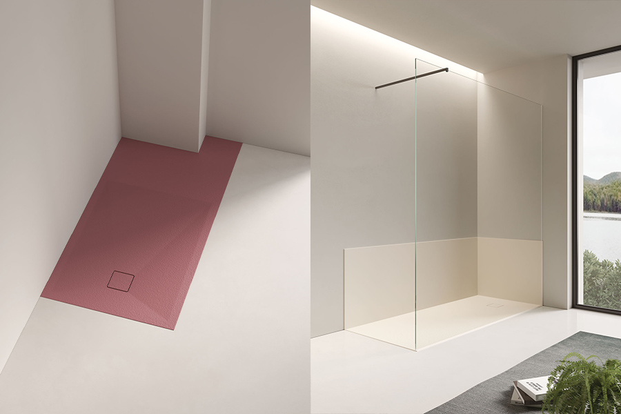 Sul piatto doccia Join è possibile realizzare lavorazioni su misura ed estendere materiale e finitura anche alle pareti.