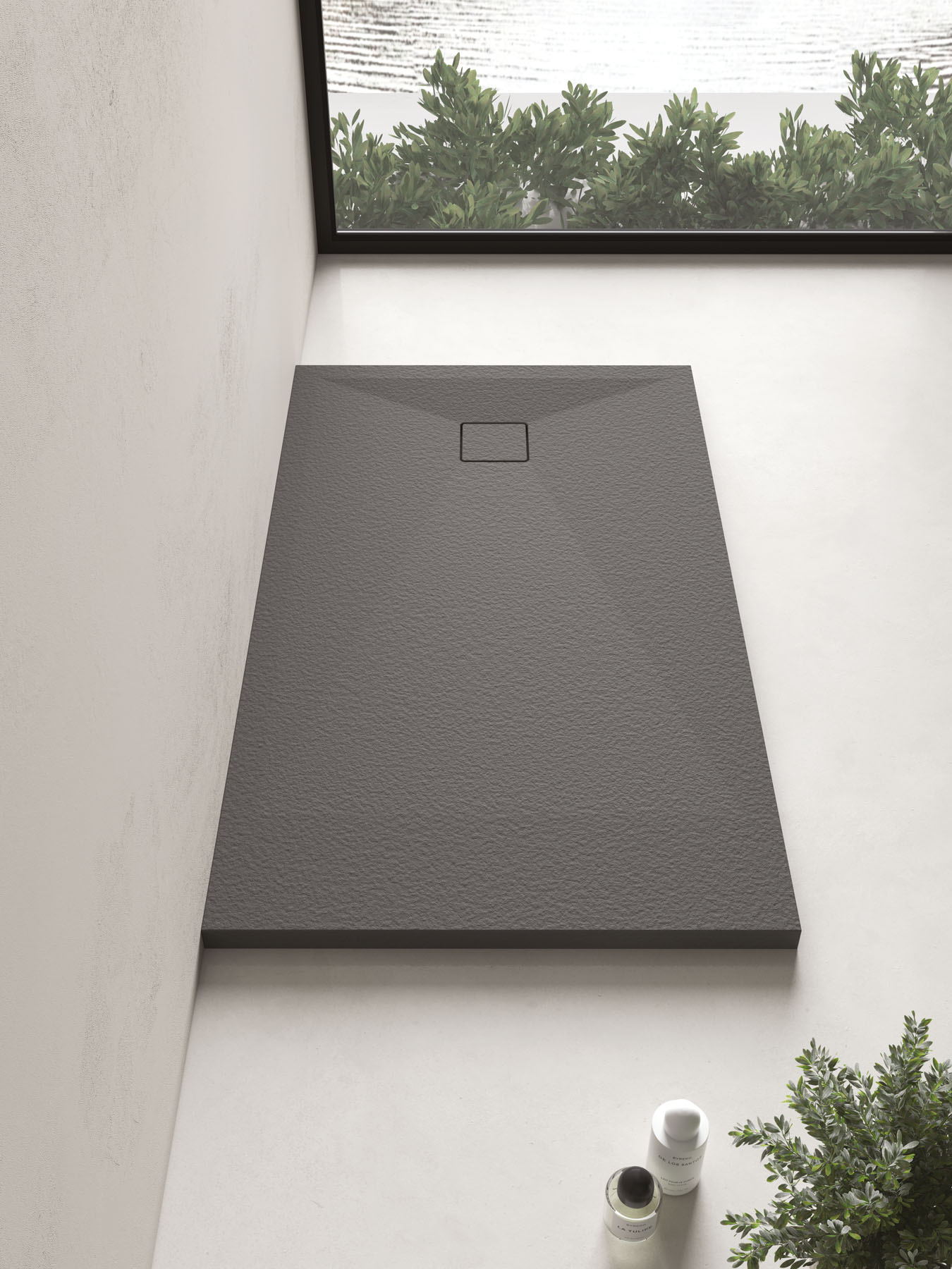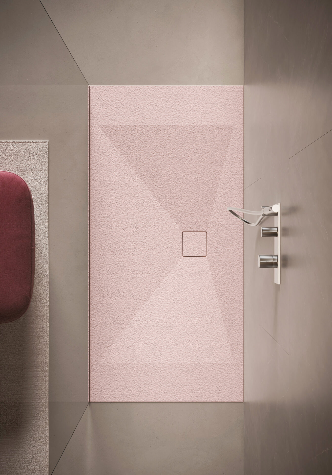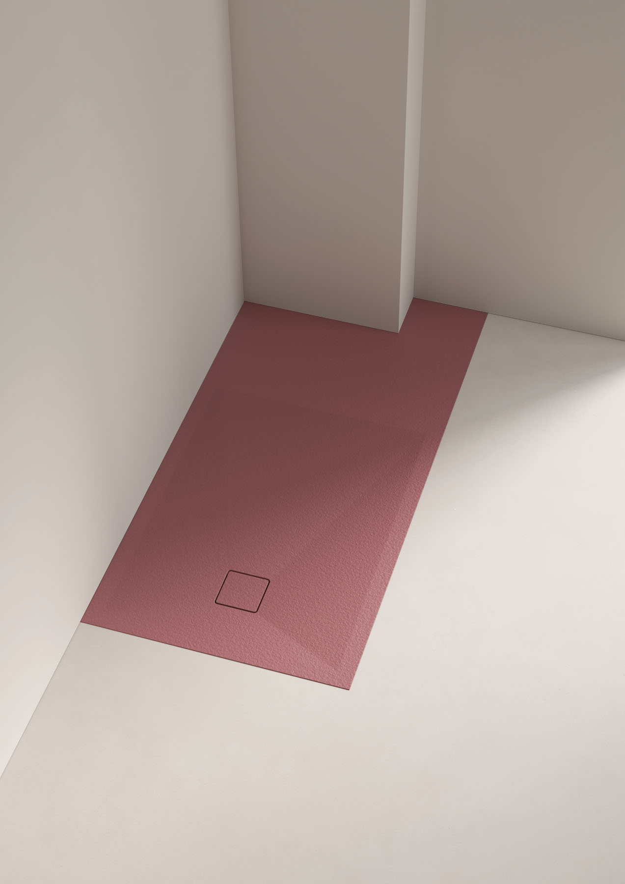 Piatto doccia dalla caratteristica texture superficiale, Join si adatta alle diverse esigenze progettuali. È disponibile nella versione a filo pavimento o in appoggio, in molteplici finiture. Questo modello prevede la realizzazione su misura. La piletta, collocata sul lato corto del piatto, è proposta in tinta.