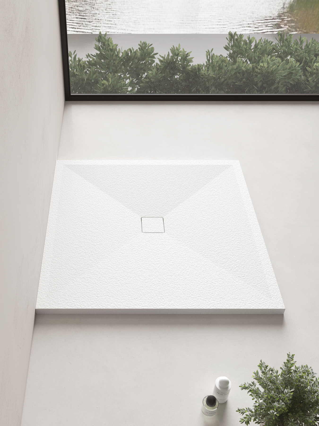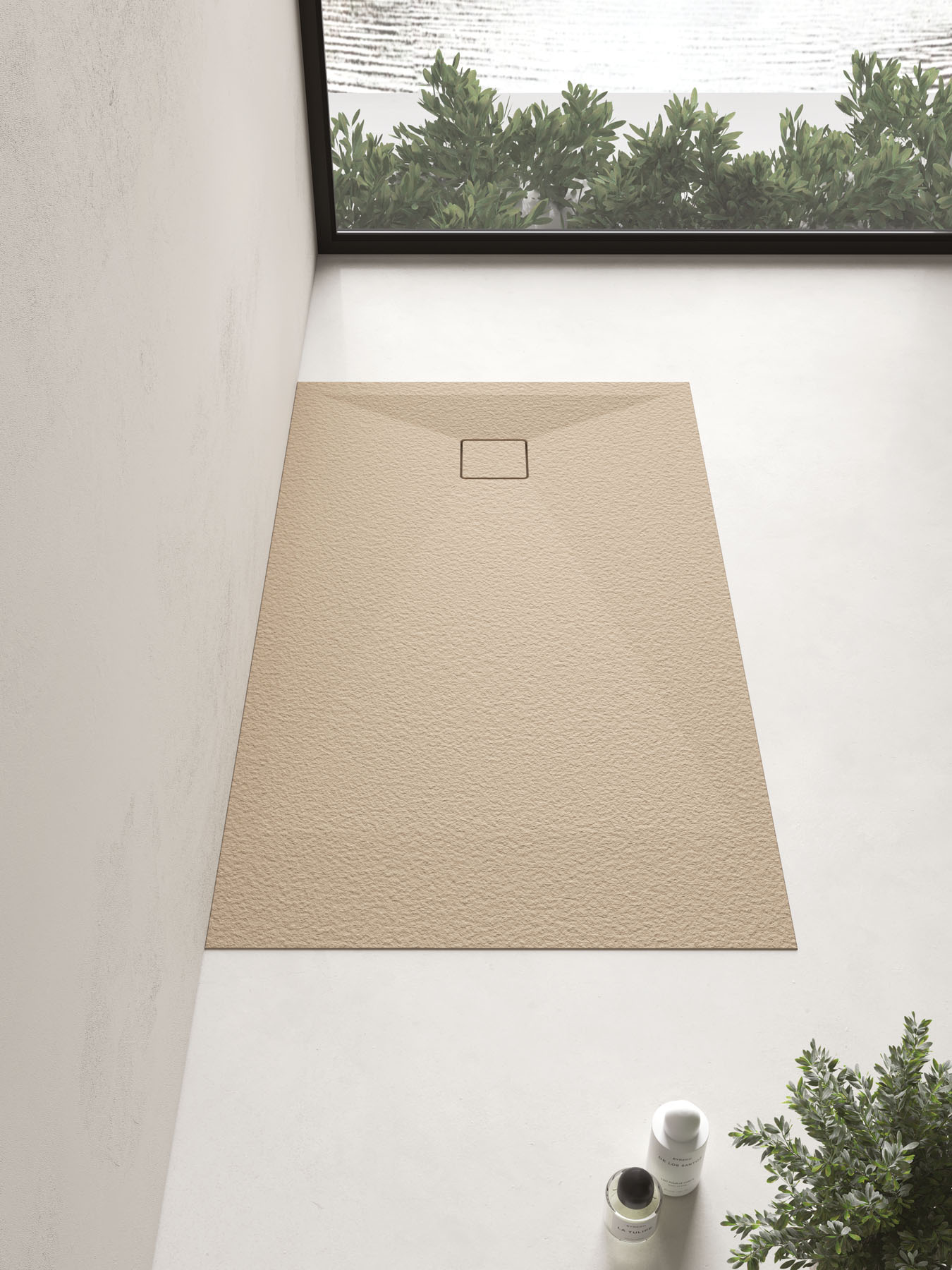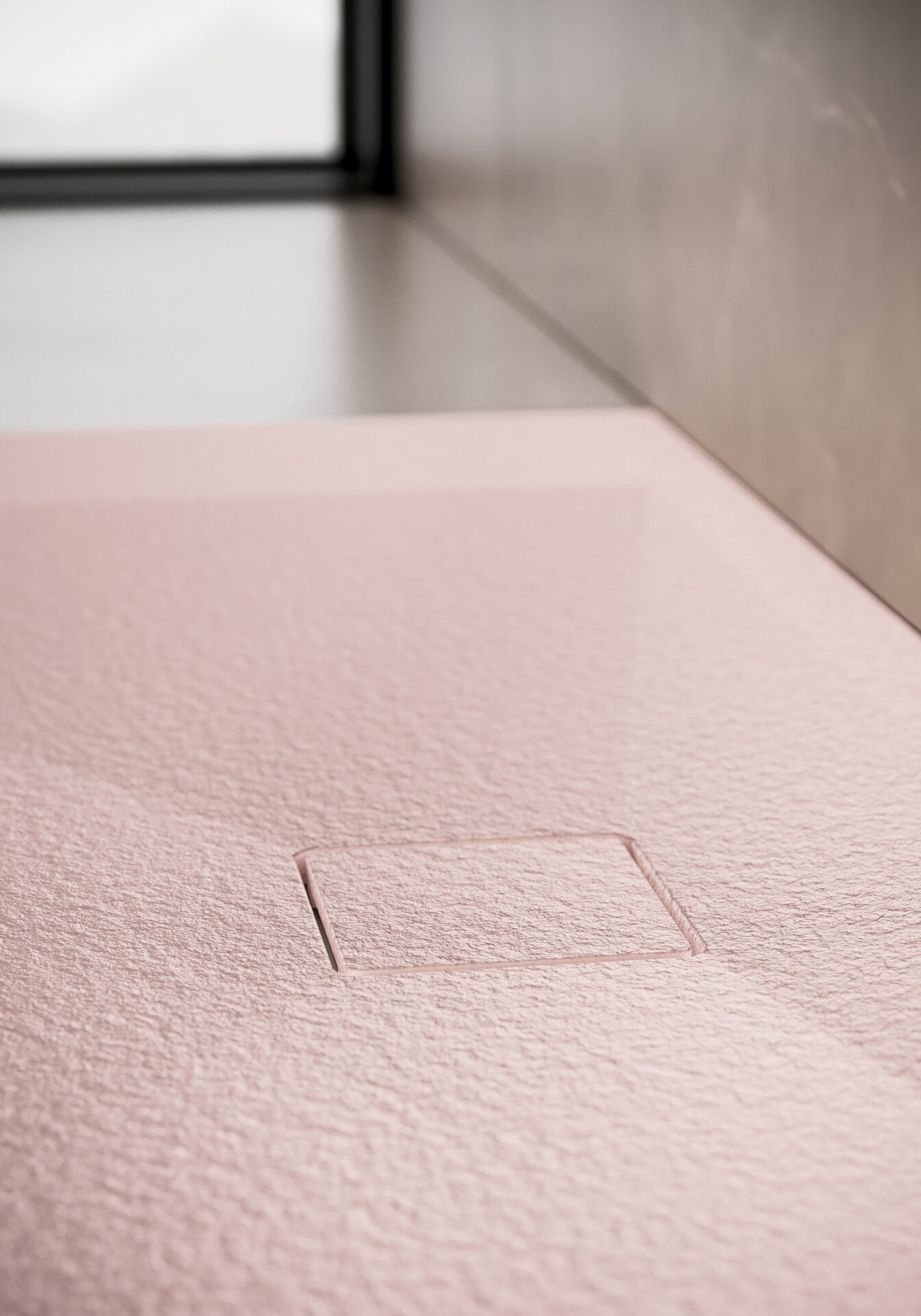 Piatto doccia dalla caratteristica texture superficiale, Join si adatta alle diverse esigenze progettuali. È disponibile nella versione a filo pavimento o in appoggio, in molteplici finiture. Questo modello prevede la realizzazione su misura. La piletta, collocata sul lato corto del piatto, è proposta in tinta.