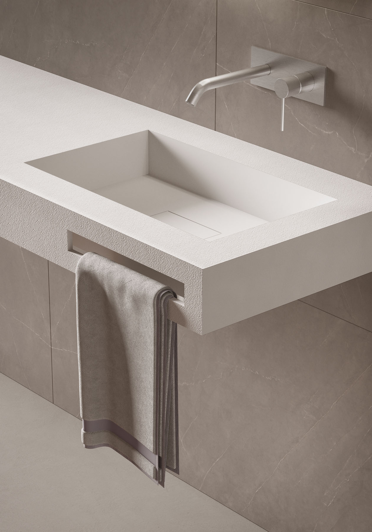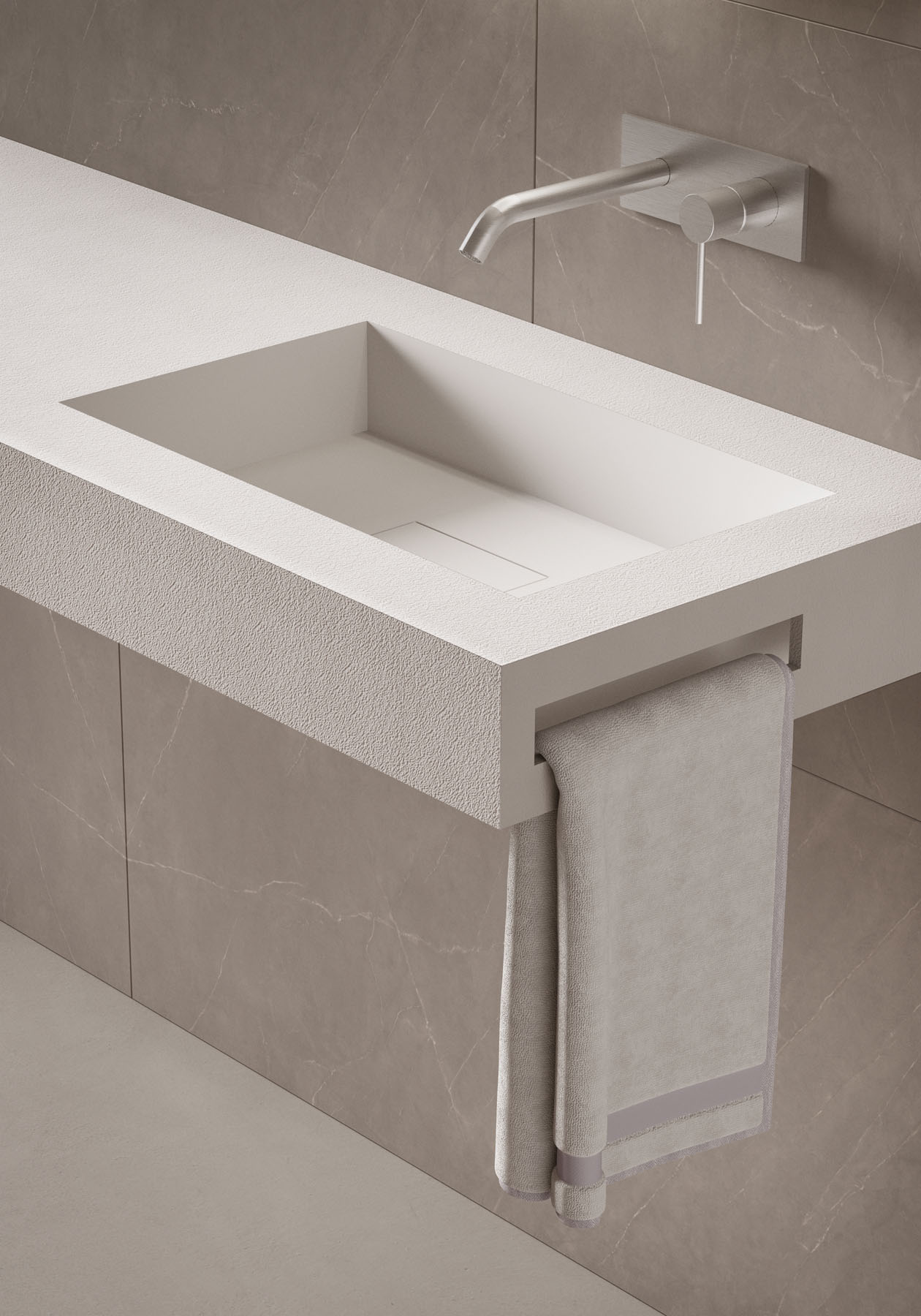 Abbinabile al top scatolato con vasca integrata e al termoarredo Helios nella medesima texture e finitura.