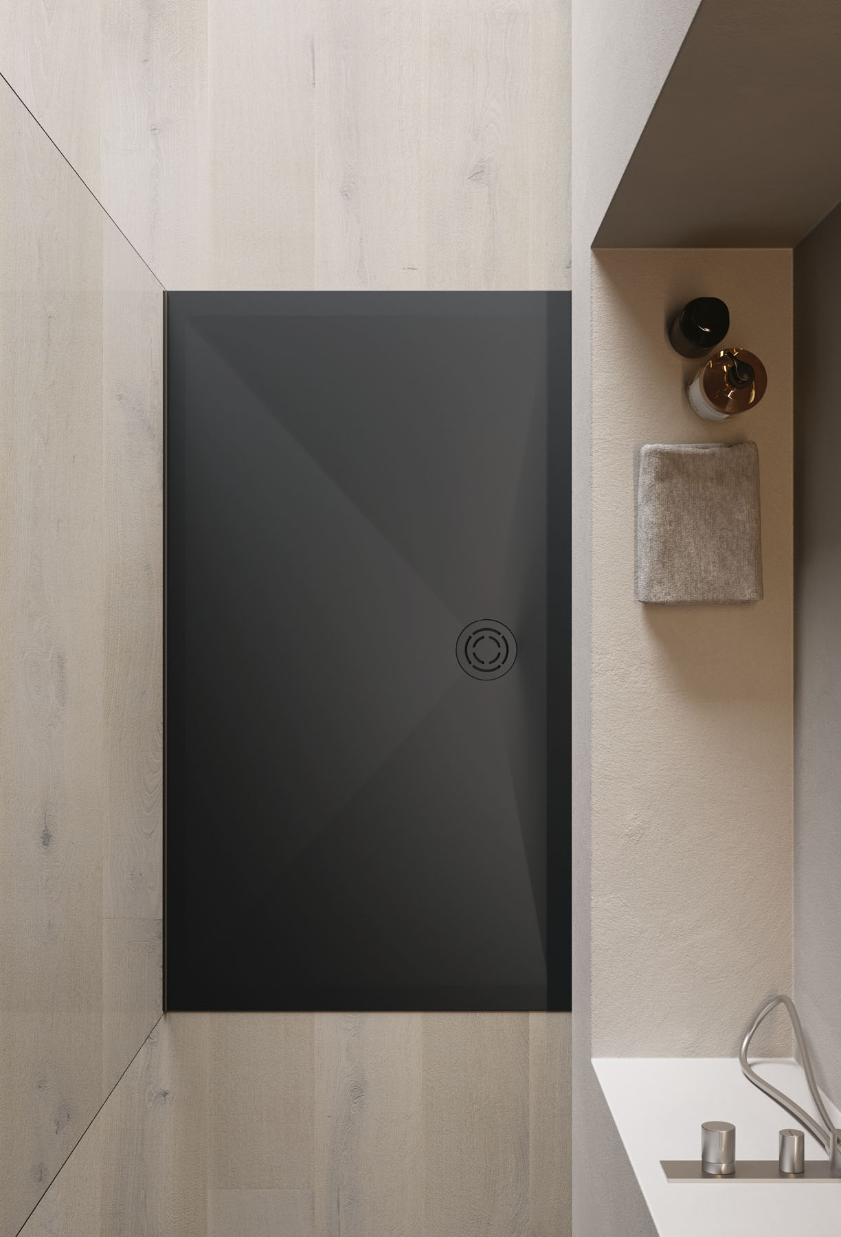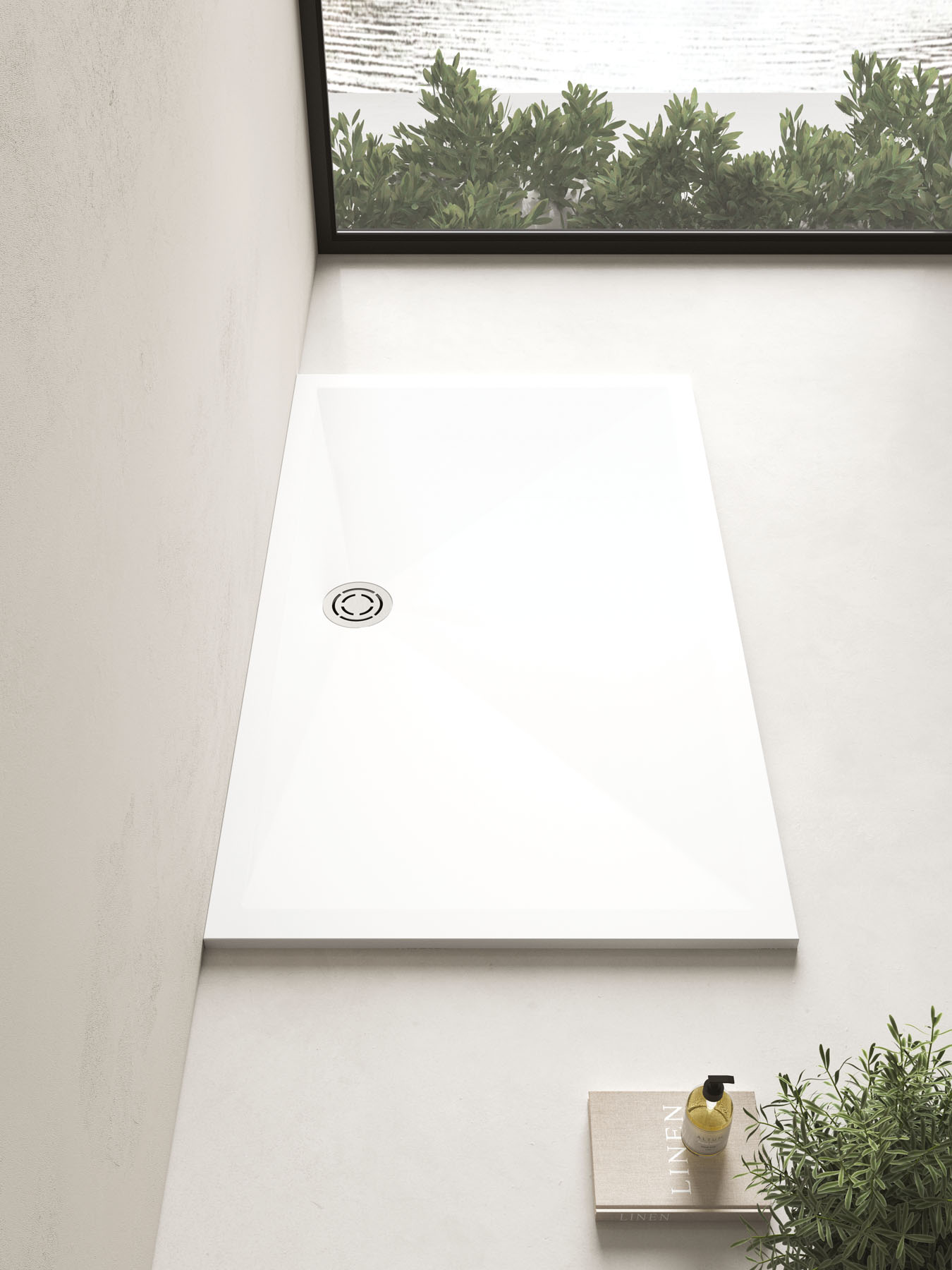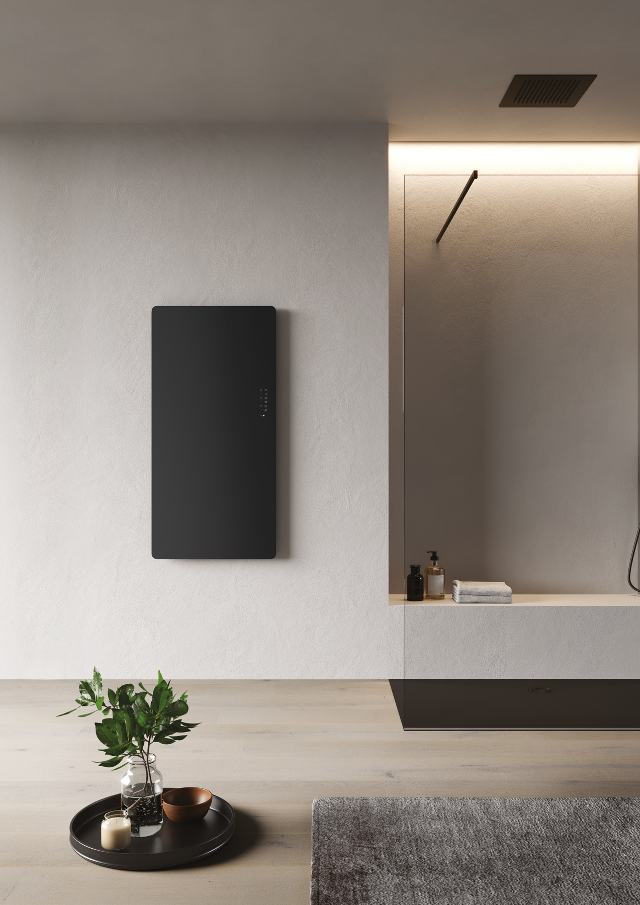Un approccio di tipo sartoriale caratterizza il nuovo piatto doccia Mohair, disponibile in due materiali Aquatek bianco o Aquagel color opaco. La piletta tonda, disponibile in acciaio Inox Spazzolato o in finitura, è collocata sul lato lungo. In abbinamento il termoarredo Helios nella medesima texture.