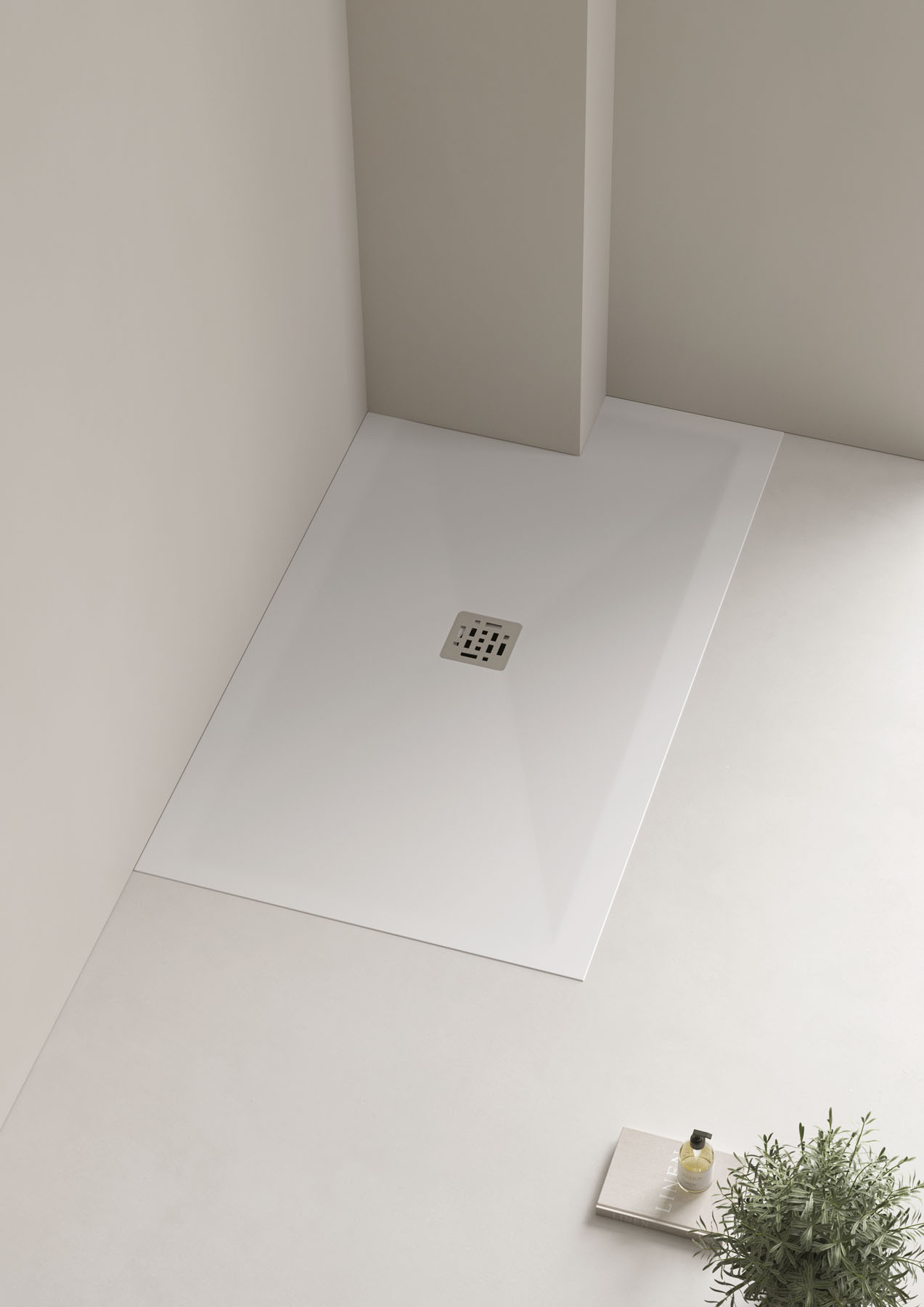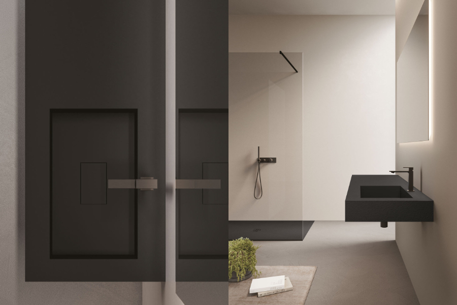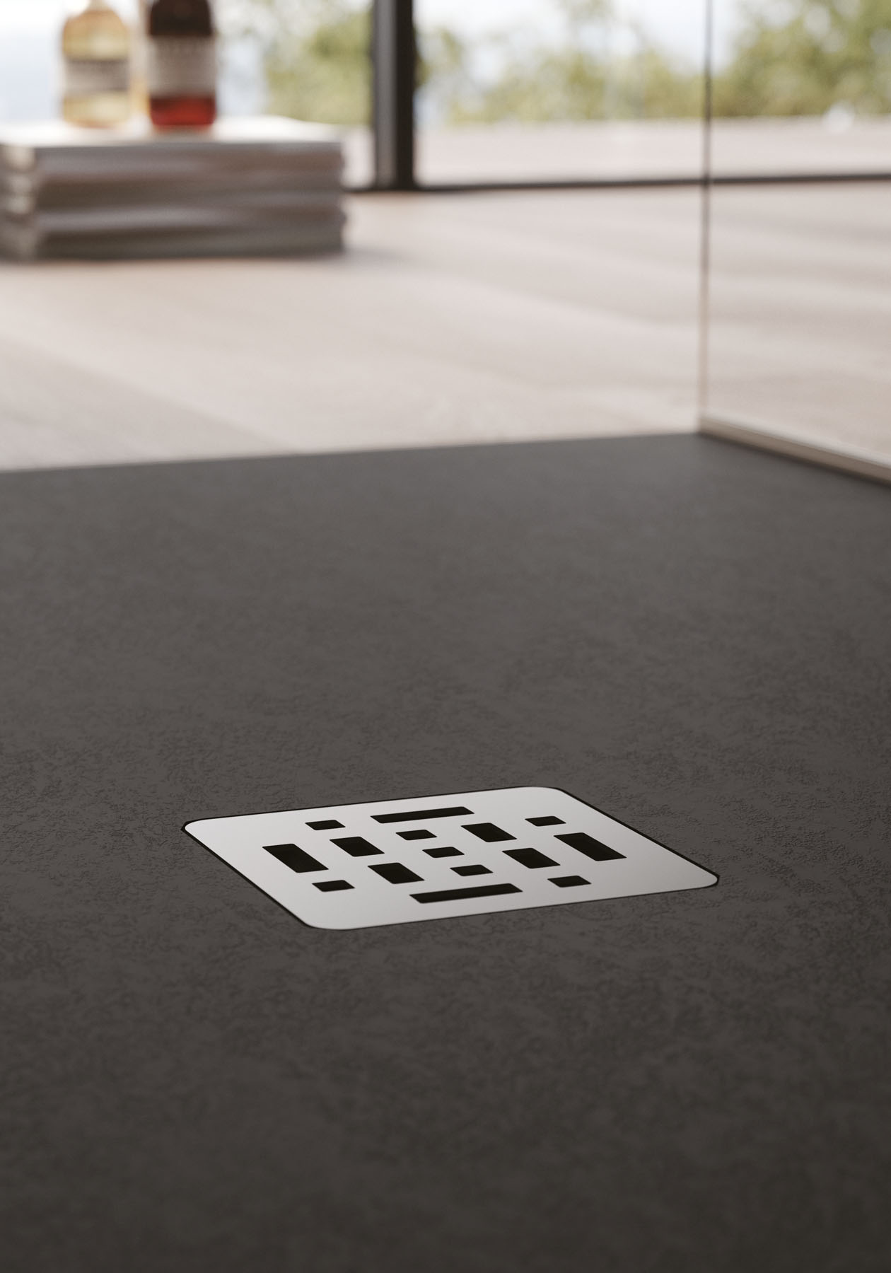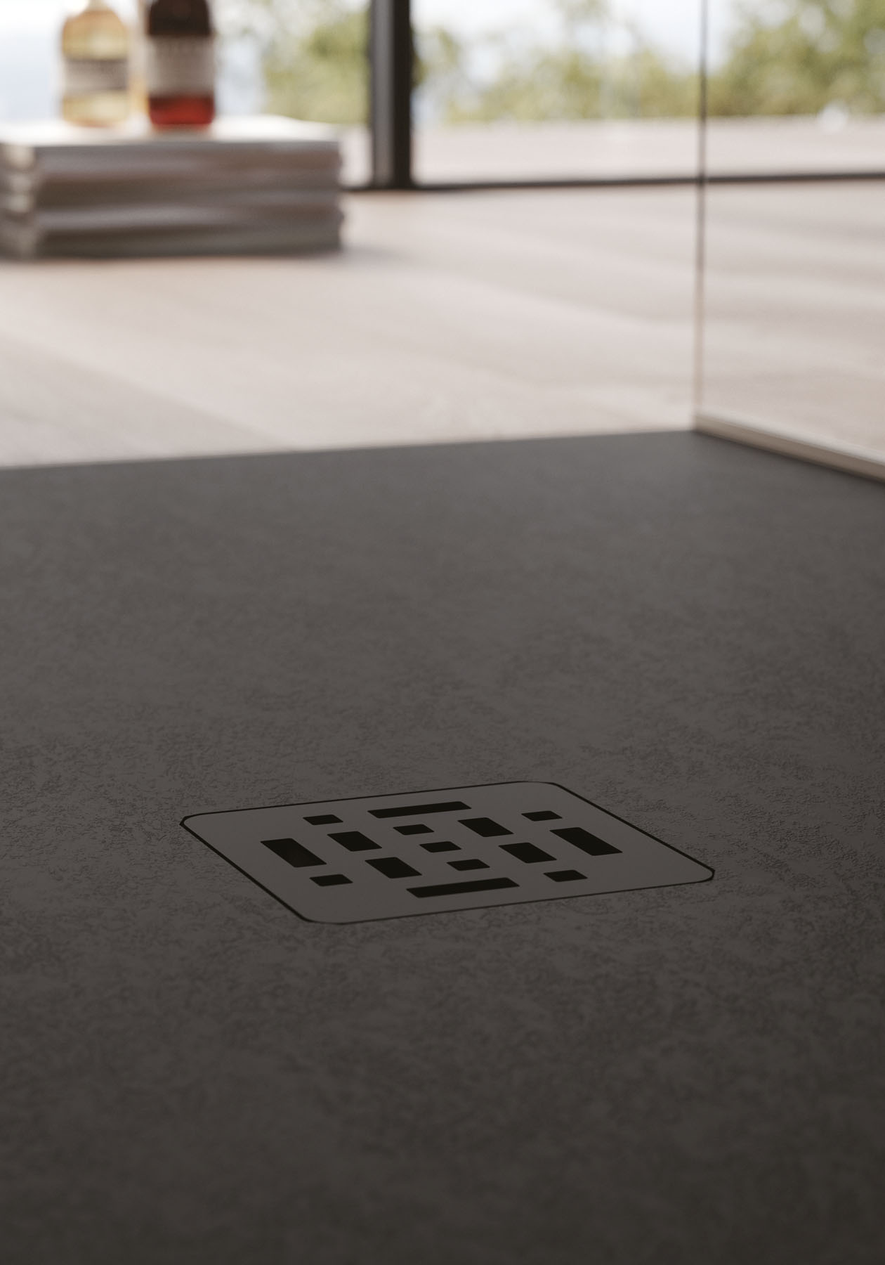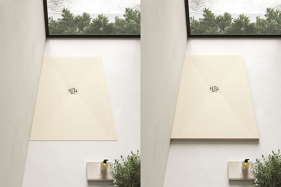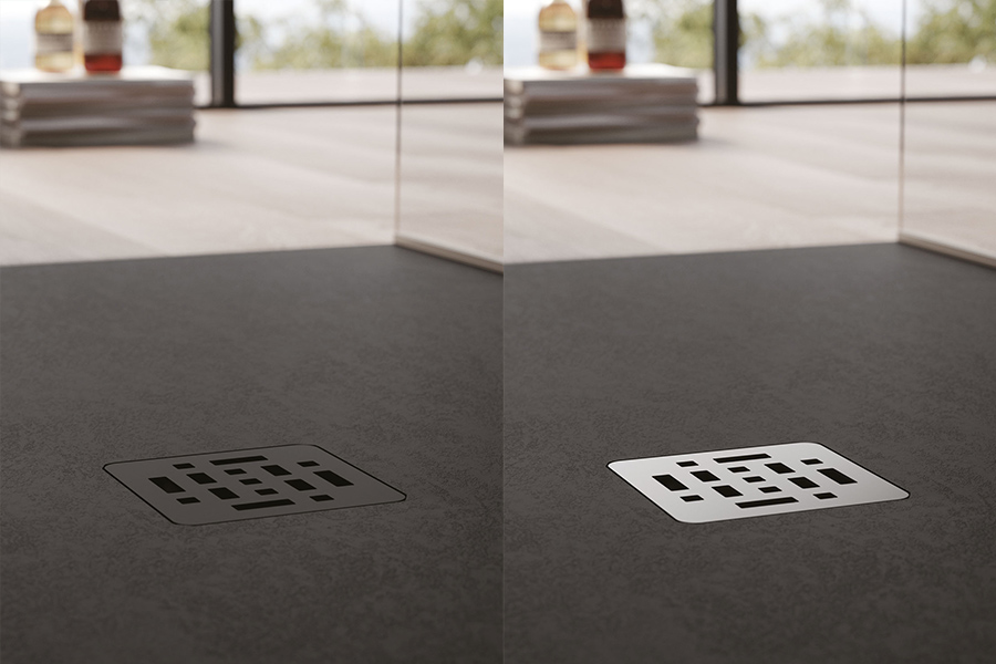 Espressione di eleganza indiscussa, il piatto doccia Open in Tecnogel ha la superficie texturizzata e piletta centrata proposta in tinta o in inox spazzolato.