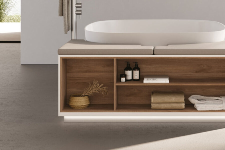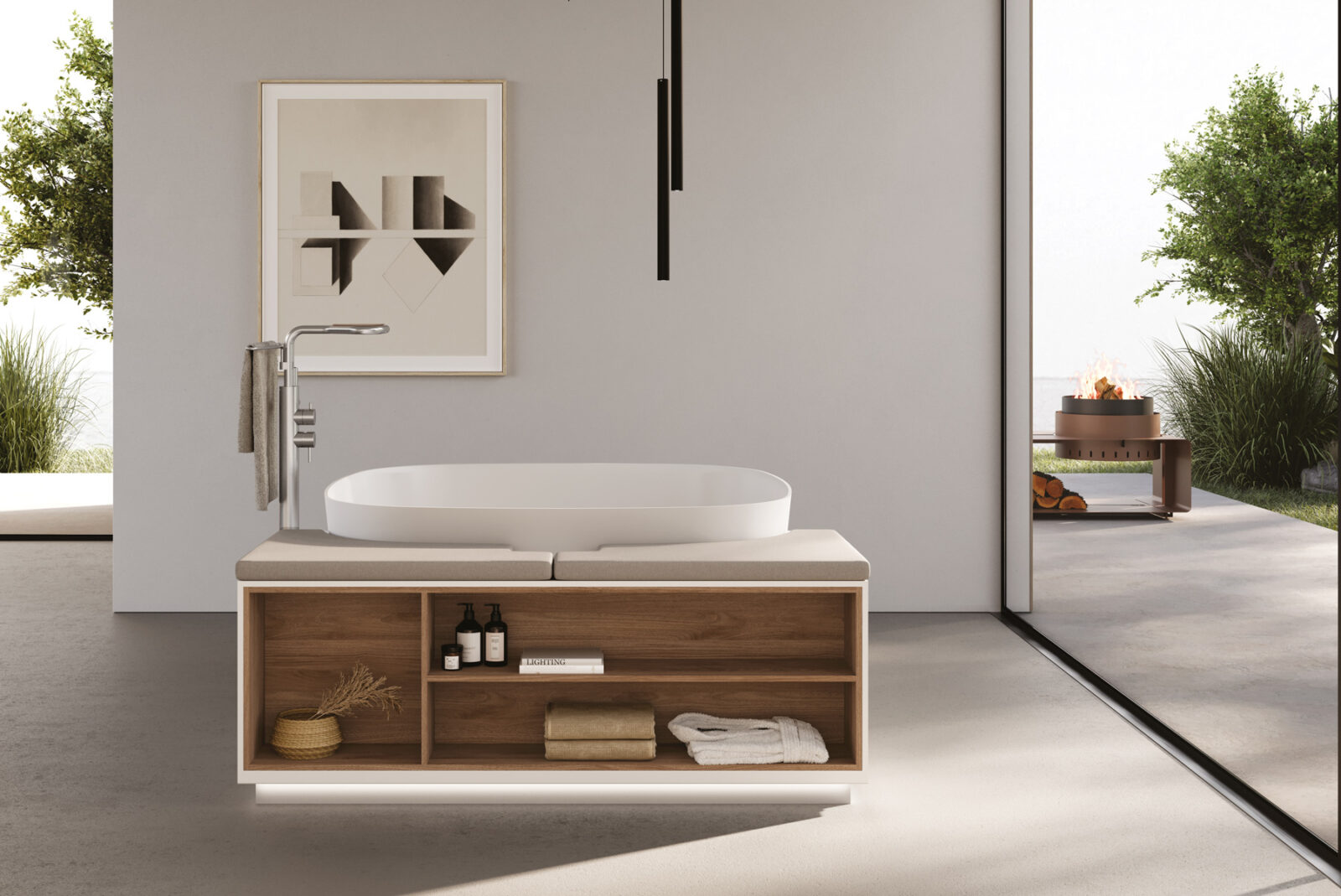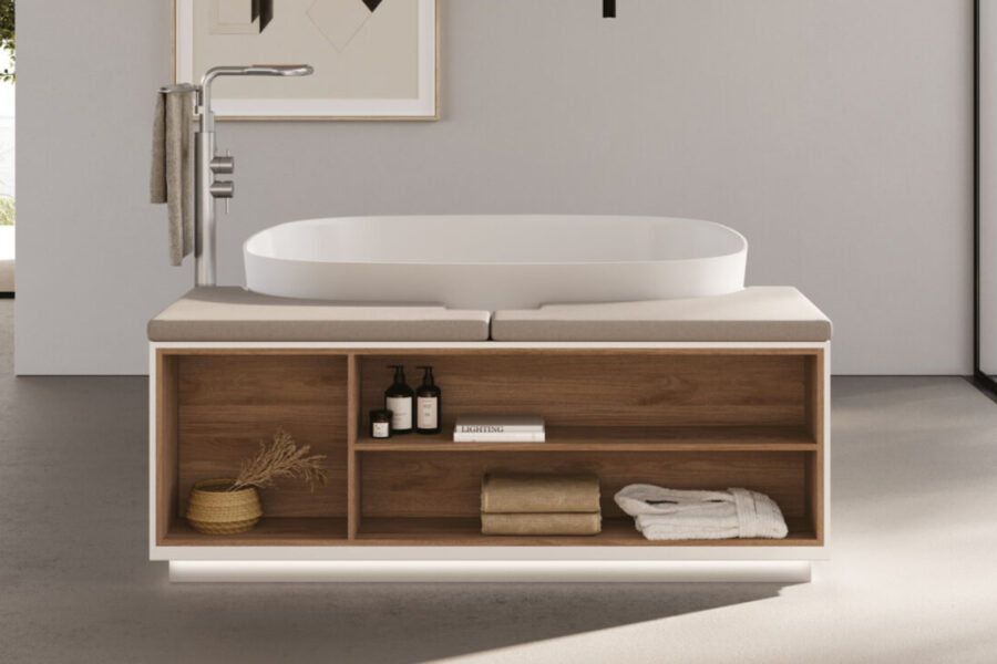 Matt white Aquatek bathtub. Lacquered open storage compartment.