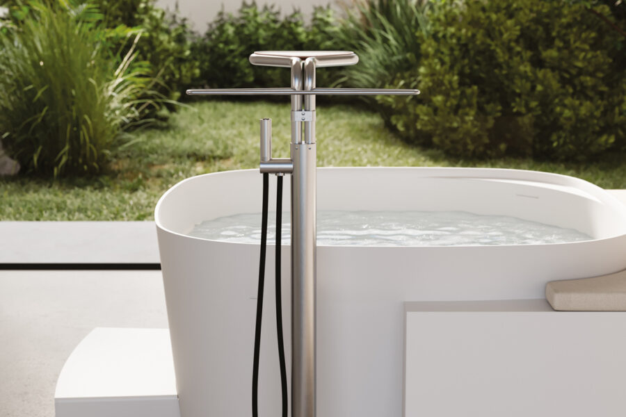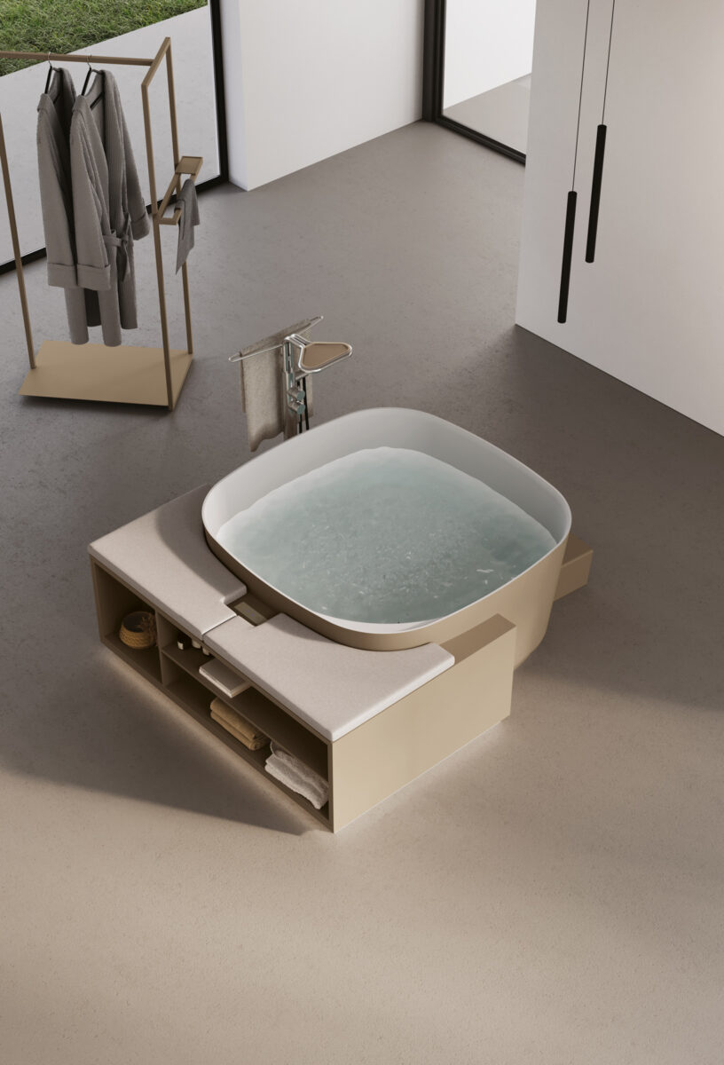 The iconic appeal of the Fonte airpool bath is further amplified by its perimeter floor lighting, which enhances its striking presence and transforms it into the focal point of the room. This exclusive centrepiece product is designed for those seeking a wellness oasis that blends perfectly with the surrounding space. Made in Italy.