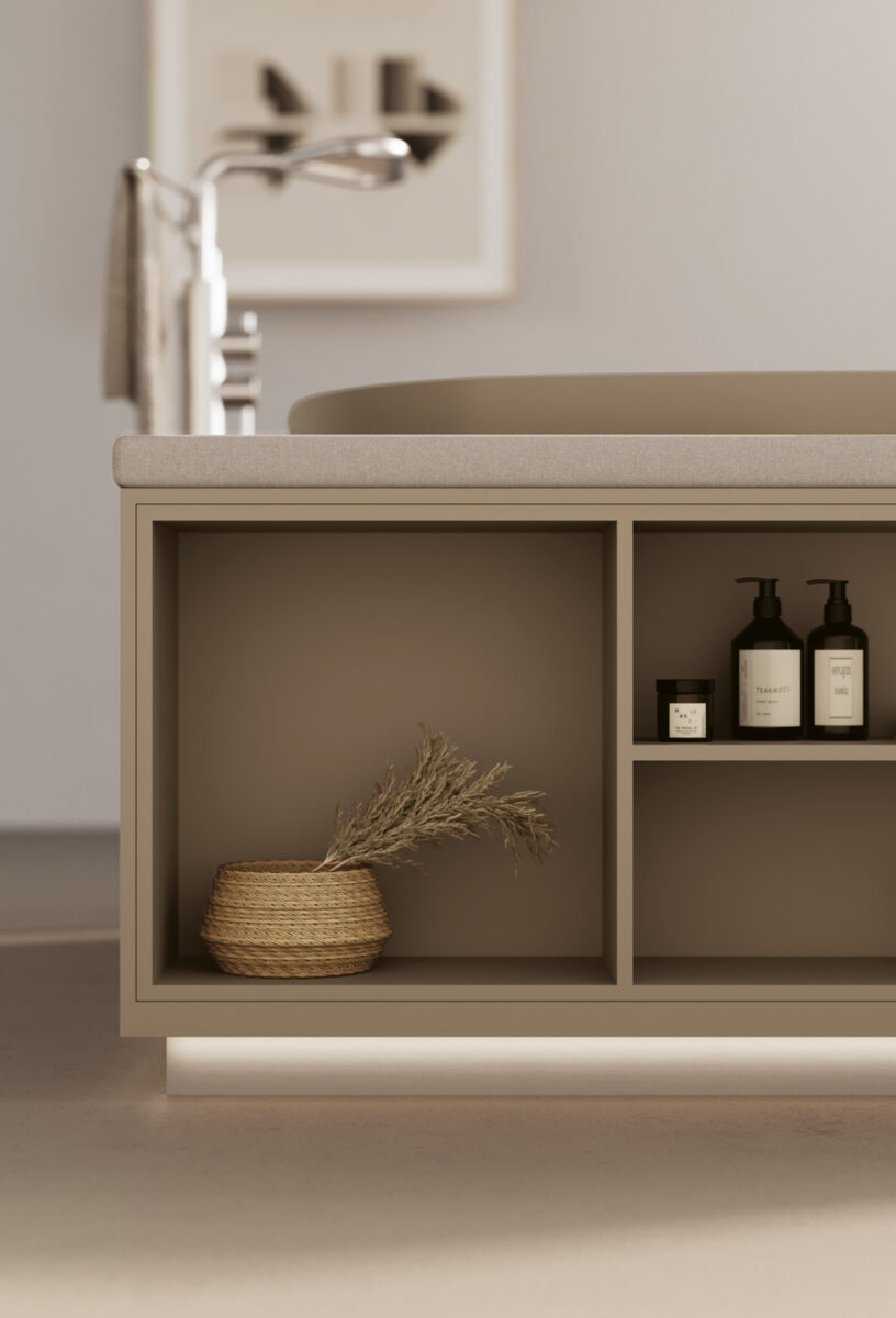 The open storage compartment is offered in any colour in the Ideagroup, RAL, or NCS palettes, or in any finish in the Via Condotti, Dolcevita and Dogma collections (Rovere Sbiancato, Naturale, Fumo, Mattone, Moro).