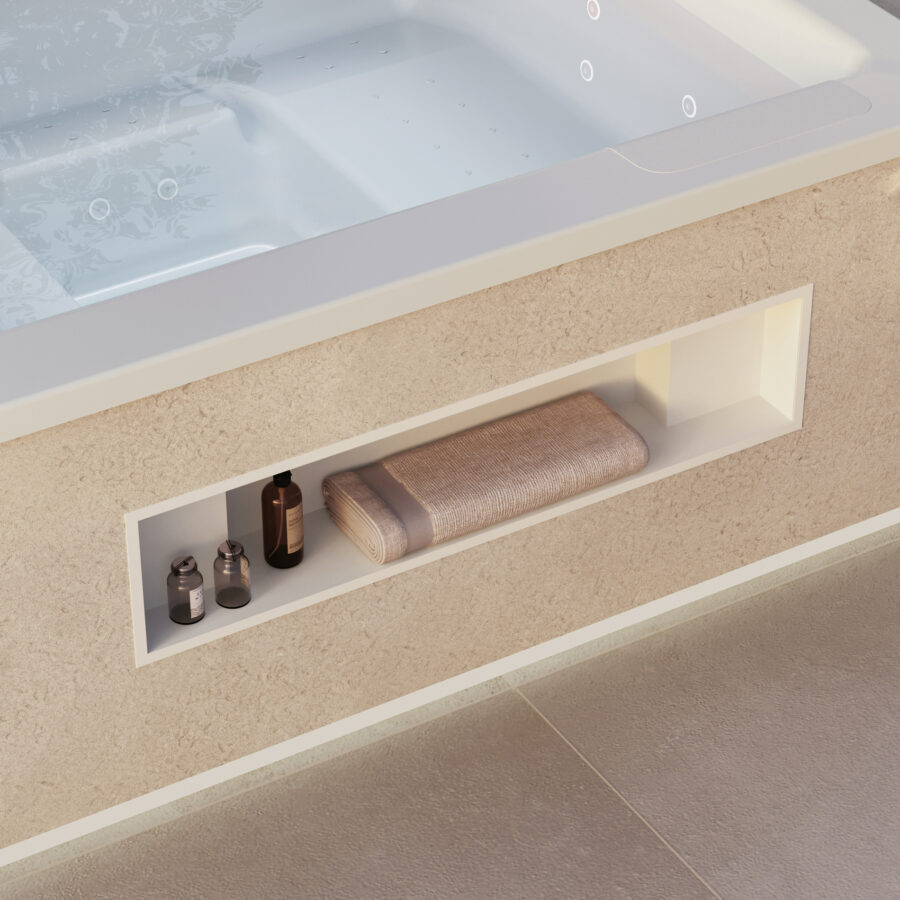 Featuring neat, clean lines, the Gilium hot tub creates a soothing haven for daily moments of relaxation. This hot tub features two comfortable seats and two ergonomic loungers to accommodate up to four adults, along with invigorating massage jets for ultimate pampering. Free-standing and built-in versions available. Made in Italy. Skirting panels in a wide range of colours.