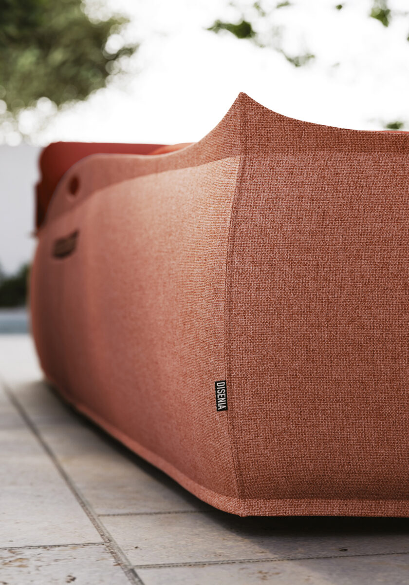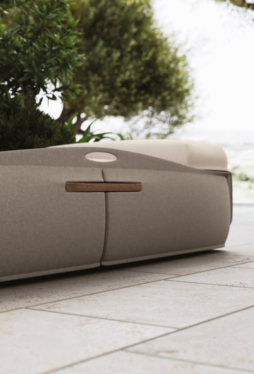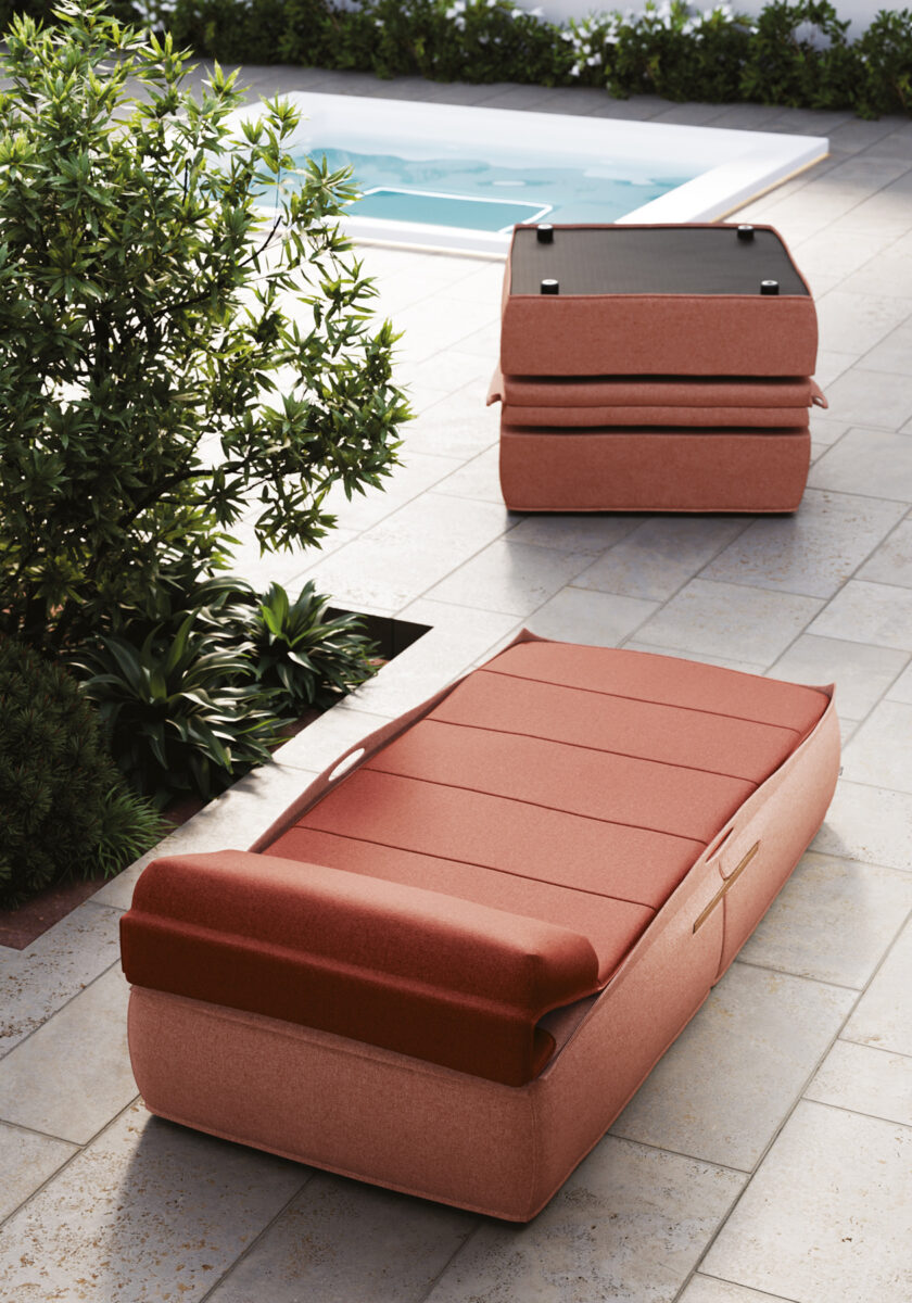 Fabriqué avec un tissu technique adapté à une utilisation en extérieur. Revêtement matelassé avec coussin intégré, disponible en 3 combinaisons de couleur : Lino/Canapa, Menta/Salvia, Mattone/Paprika. Étagère coulissante en Okoumé.
