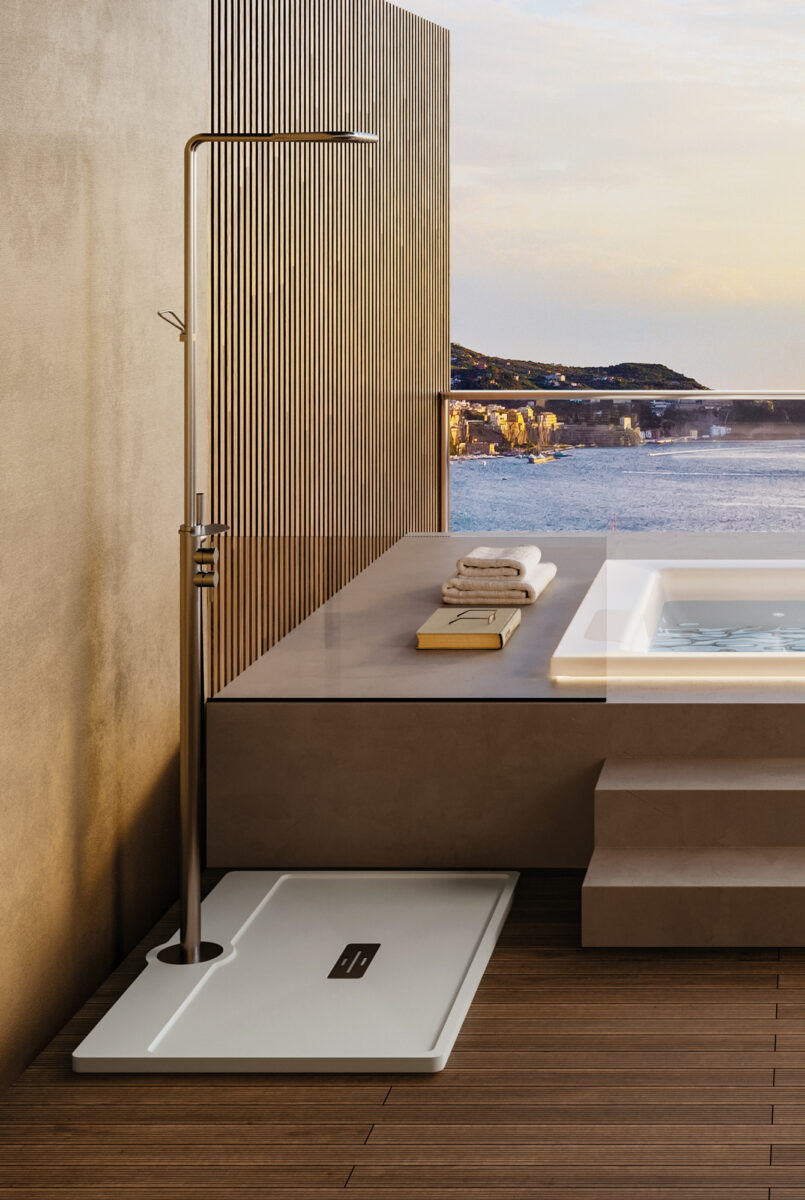 Receveur de douche en Aquatek blanc, disponible en trois tailles, approprié aux espaces extérieurs et intérieurs, combiné aux colonnes de douche Grecale et Libeccio. Bonde de vidage disponible en Acciaio Spazzolato ou de la même couleur que la colonne de douche. Disponible en trois tailles.